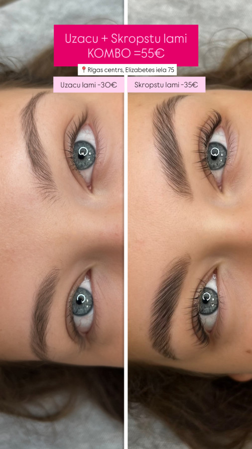 Kombo izdevīgāk 55€ Uzacu + skropstu laminēšana Atsevišķi: • Uzacu lami -30€ • Skropstu lami -35€ Procedūras laikā uzacis tiek: • Ielaminētas (tās kļūst paklausīgākas) • Nokrāsotas • Veikta formas korekcija • Pabarotas ar vitamīniem Skropstas tiek: •Atliektas •Nokrāsotas •Pabarotas ar vitamīniem Noturība 1-2 mēneši. Ērta lokācija: Rīga, Elizabetes iela 75 Ig: laura.vel.beauty