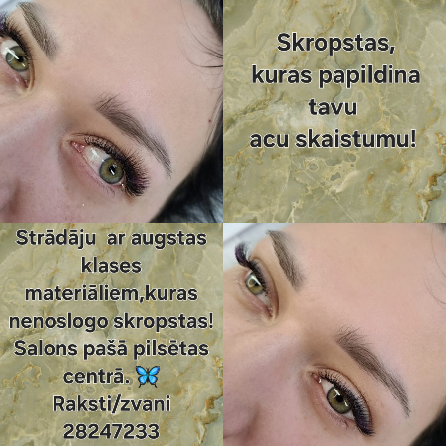Sveikas! ? Esmu sertificēta skropstu pieaudzēšanas speciāliste. ?Mans uzdevums- izcelt jūsu acu skaistumu,ko ar prieku arī daru.? Atrodos pašā pilsētas centrā. Klasika ,YY- 28€ 2D,2D Mix ar 3D - 30€, 3D, 4D-35€ 5D- 40€ Skropstu noņemšana (cita meistara) - 5€ (+ dimantiņi, krāsainās skropstiņas - 0€) 2 mēneša sestdienas veltu tiem klientiem, kuri netiek darba dienā + 5€ Rakstat/zvanat 28247233
