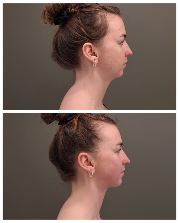 Sejas modelējošā masāža. Rezultāts pēc vienas reizes - pacēlies sejas ovals, izteiktāks žokļa stūris, samazinājies dubultzods. Augšējā bilde pirms, apakšā pēc.