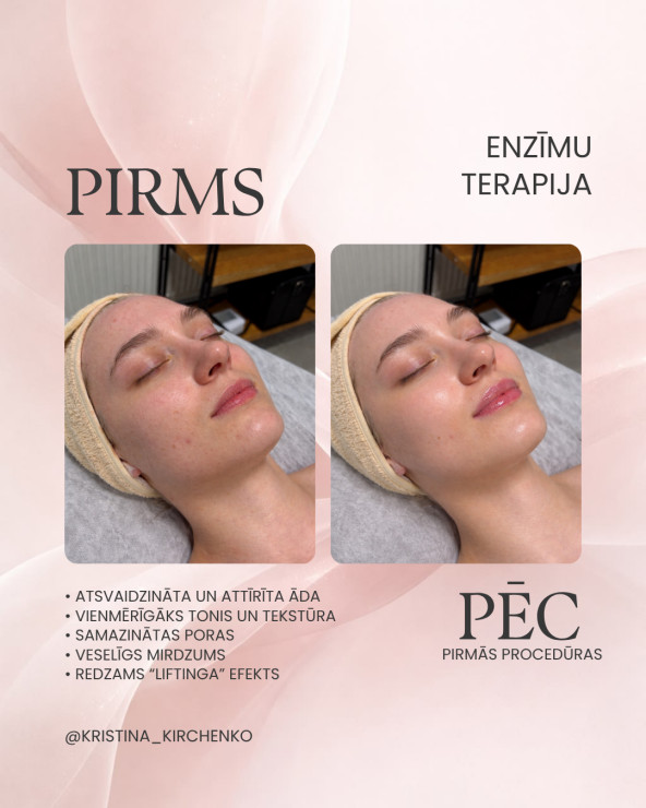 JAUNS LĪMENIS ĀDAS KOPŠANĀ Ja vēlies redzamu rezultātu bez agresīvām metodēm — šī procedūra ir radīta tieši Tev. Bioenzīmu terapija darbojas dziļi ādā, aktivizējot tās dabiskos atjaunošanās procesus un uzlabojot kopējo ādas kvalitāti. Tā ir ideāla izvēle, ja āda ir nogurusi, zaudējusi mirdzumu vai nepieciešama intensīva, bet saudzīga atjaunošana. Rezultāts? Tīrāka, vienmērīgāka un dzīvīgāka āda jau pēc pirmās procedūras. Rezultāts: • Atsvaidzināta un attīrīta āda • Vienmērīgāks tonis un tekstūra • Samazinātas poras • Veselīgs mirdzums • Redzams “liftinga” efekts Bioenzīmu terapija — tā ir gudra, mūsdienīga pieeja skaistumam, kas respektē Tavas ādas vajadzības.