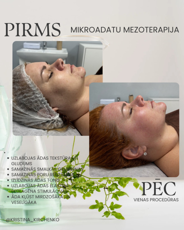 Mikroadatu mezoterapija jeb Dermapen ir efektīva, neinvazīva ādas atjaunošanas procedūra, kuras laikā ar smalku mikroadatu palīdzību tiek stimulēta ādas dabīgā reģenerācija un kolagēna veidošanās. Procedūras laikā ādā tiek veidoti mikroskopiski kanāliņi, kas veicina aktīvo vielu (serumu, vitamīnu, hialuronskābes) dziļāku uzsūkšanos un iedarbību. Ieguvumi: • Uzlabo ādas tekstūru un tonusu • Samazina smalkās grumbiņas un novecošanās pazīmes • Mazina pigmentāciju un aknes rētas • Veicina ādas mitrināšanu un elastību • Piešķir ādai veselīgu mirdzumu Procedūra ir piemērota sejai, kaklam, dekoltē zonai un galvas ādai, lai veicinātu matu augšanu pastiprinātas matu izkrišanas gadījumā. Rezultāts: Āda kļūst gludāka, tvirtāka un vizuāli jaunāka jau pēc pirmajām procedūrām. Lai sasniegtu ilgstošu efektu, ieteicams procedūru kurss.