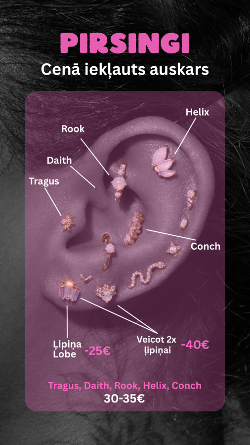 Pīrsingu duršana (cena ar auskaru) • Ausu ļipiņa 1x 25€ • Durot uzreiz 2 ļipiņas par abiem 40€ • Skrimslī 30-35€ • Degunā 30€ • Nabā 35€ Ērta lokācija: Rīga, Elizabetes iela 75